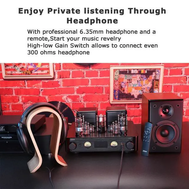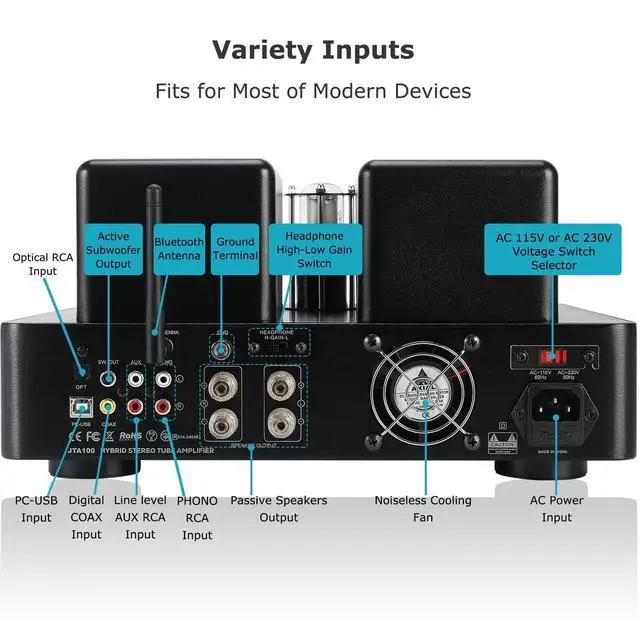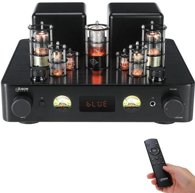 Inputs & Outputs: This entry-level HiFi amplifier supports multiple inputs including AUX, COAX, PHONO, OPT, and BT 5.0. It has a headphone output and a subwoofer output, enhancing its versatility and adaptability for various audio setups. A Remote provides controlling from a distance. With high-low gain headphone output switch, the JTA100 amplifier can drive 16-600 ohms headphone easily with rich detail and clarity. ^^ Vacuum Tubes Preamp & Transistor