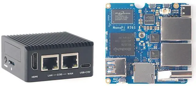 [Light NAS Video Play Router] NanoPi R76S (as R76S) is an open-sourced mini IoT gateway device with two PCIE 2.5G ethernet ports designed and developed. It is integrated with a Rockchip RK3576 CPU. It supports booting with TF cards and works with operating systems such as FriendlyWrt or OpenMediaVault etc. NanoPi R76S is a router featured with multiple Ethernet ports, light NAS and video playing. It is a cannot-miss platform with infinite possibilities for geeks, fans and developers. ^^ [Bandwidth Increased by 50%] NanoPi R76S mini router multi-core score exceeds the same class of products by more than 30%, supports 6TOPS NPU, optional - LPDDR4X (2GB/4GB) and 16GB LPDDR5 RAM memory, built-in 32GB/64GB eMMC, bandwidth increased by 50%, suitable for 4K video transcoding, multi-virtual machine parallel, real-time data analysis and other high-performance needs.