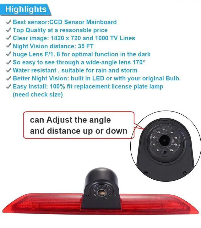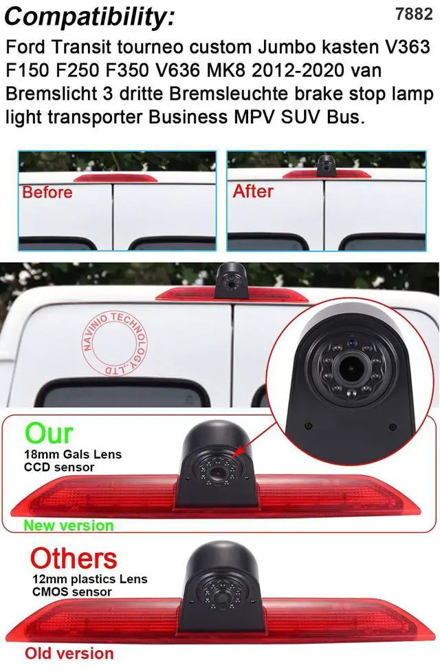 Dear customer, please must check the camera size and appearance before place a order, see if can fit your car brake light position size and appearance! Because the same car model in different countries may have some difference, please check the camera size and compare the installation of your car carefully to avoid mistake. This product could fit for all below models as expected: Replacement for Ford Transit Tourneo Custom Jumbo Kasten V363 F150 F250 F350 V636 MK8 2012-2020.
