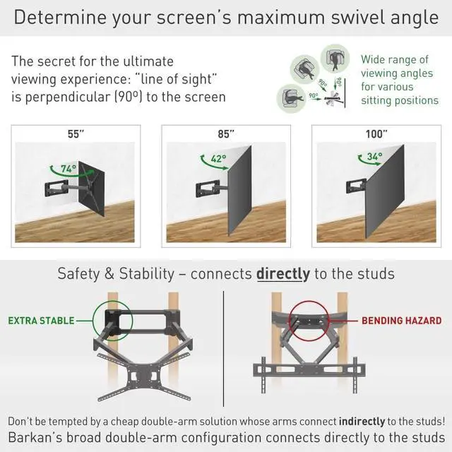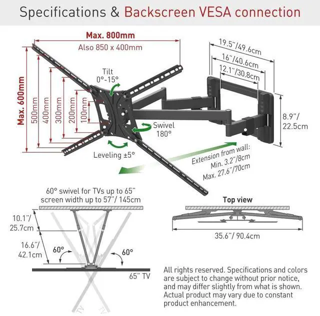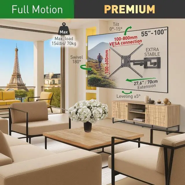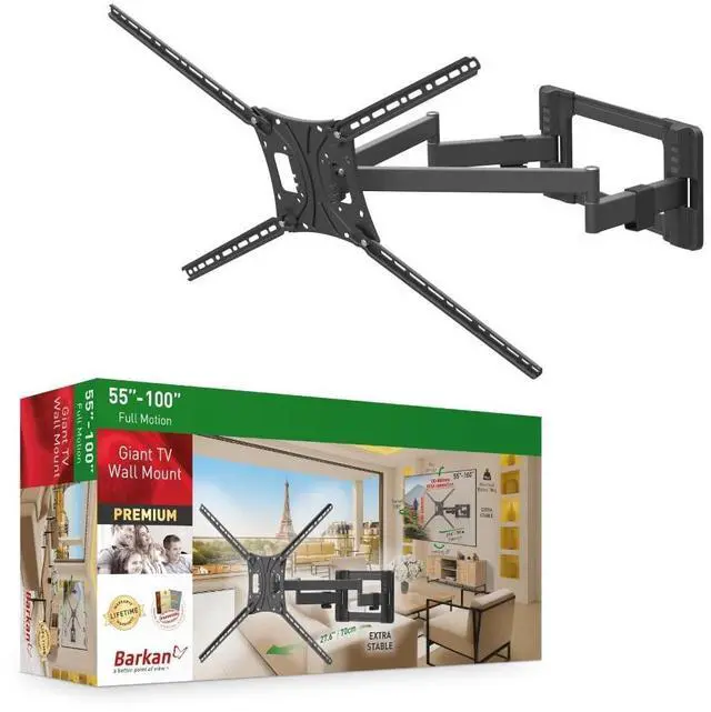 The Barkan Dual Arm Full Motion Articulating - 4 Movement TV Wall Mount, fits Flat / Curved screens sizes 55 to 100 inches and weight up to 154lbs. The minimum distance between the mount and the wall is only 3.2 in. and the maximum distance is 27.6 in. Fits TVs with VESA standard (Bracket Mounting Holes Patterns) 100x100, 100x200, 200x100, 200x200, 200x300, 300x200, 300x300, 300x400, 400x200, 400x300, 400x400, 600x400, 600x600, 600x500, 800x600, 850x400 mm and non-VESA up to 800x600 mm.