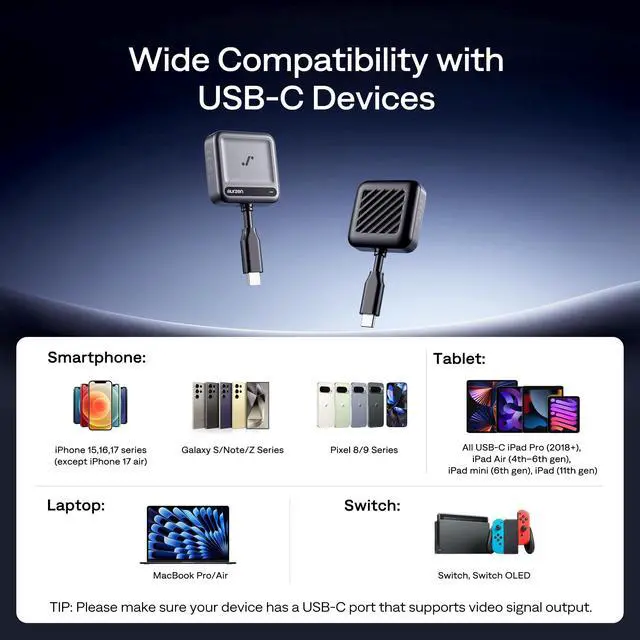 DP Alt Mode Required: Your USB-C port MUST support the DisplayPort Alternate Mode (DP Alt Mode) protocol to transmit video signals. USB-C ports used only for charging or data transfer will not work with CastPlay Pro ^^ Easy Setup and