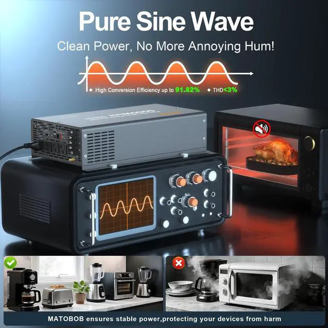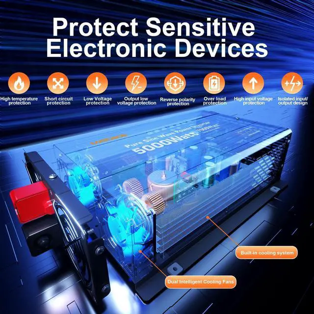 Powerful 5000W 12V power inverter --This 12V inverter delivers consistent 5000W continuous power and 7000W peak surge for 2 seconds viewable, this 5000W inverter easily runs high-draw appliances like microwaves (2000W), water pump, induction cooker, refrigerator, window ACs, fans and power tools no flicker, no hum, pure grid-quality output for sensitive electronics. It can be installed in RV, Boat, home for off grid solar, emergency