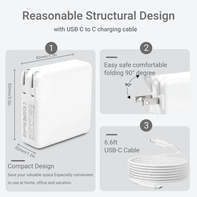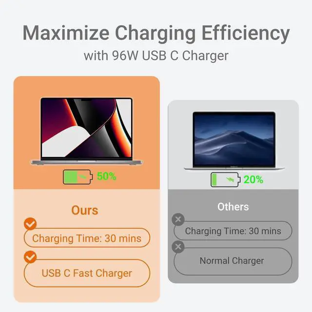 Charge Pro 16 inch (8724mAh): 2h 10mins. Equipped with "Power Delivery (USB PD) Protocol" intelligently output you. you can use this charger instead of 87W/61W/30W/29W adapter for lower wattage. These 96W USB C power adapters automatically for fast charging your MacBook Pro, laptop, iPad Pro, android phones and more USB C & Type C port devices. Whenever at home, in the office or on the road, this 6.6 ft charger cable allows you to charge quickly and efficiently.