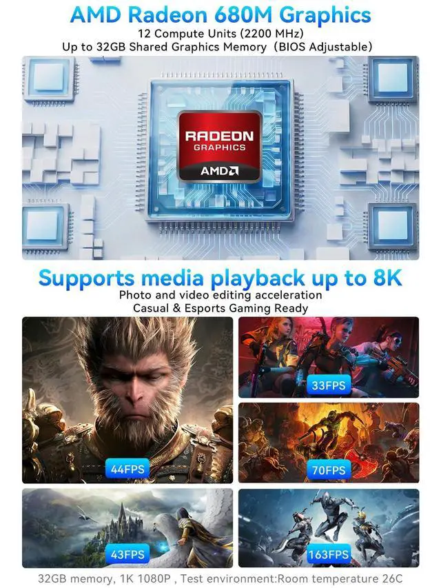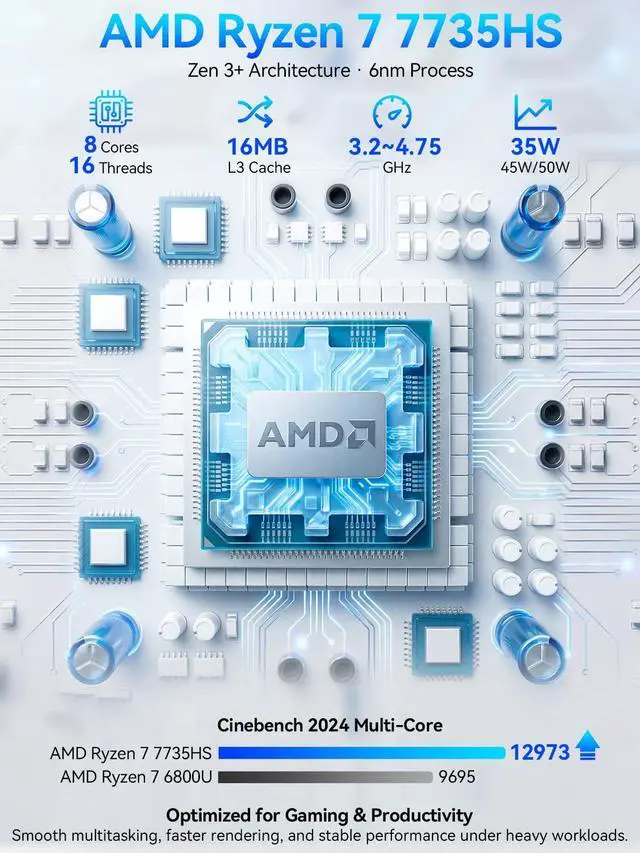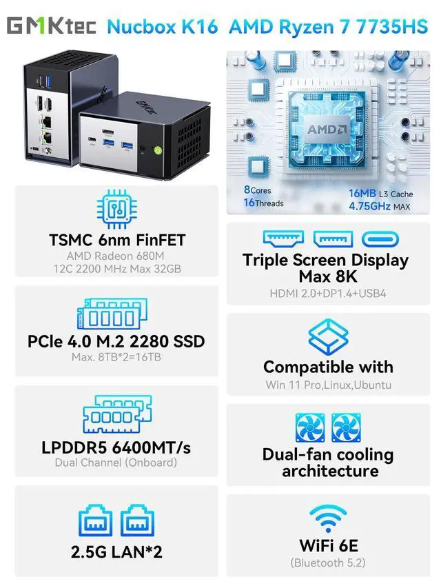 Ryzen 7 Mini PC - GMKtec Nucbox K16 Series is equipped with the latest AMD Ryzen 7 7735HS processor, 8 Cores/16 Threads, base clock of 3.2 GHz, Up to 4.75GH z, Based on the ZEN 3+ architecture, this small but powerful mini pc delivers satisfying results in productivity, office work, and gaming. 30% upgraded performance over the Ryzen 7 6800H, 6800U, 5825U. ^^ BLAZING-FAST MEMORY SPEED & STORAGE EXPANSION - Fly through tasks with ultra-fast 32GB LPDDR5 6400MT/S RAM and a 1TB NVMe SSD. With dual M.