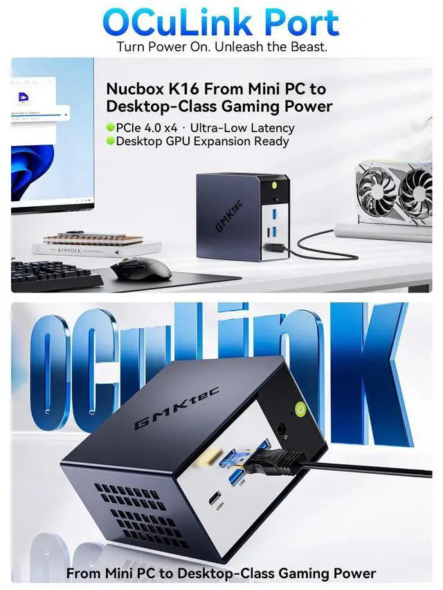 2 2280 slots supporting up to 4TB per slot, 8TB total storage, you have immense room for your entire game library, projects, and media files. ^^ ULTIMATE CONNECTIVITY FOR GAMERS & PROS - Unlock desktop-level graphics with the exclusive Oculink port for a direct, high-speed eGPU connection. Plus, a versatile USB4 port (40Gbps, PD Charging, Video) offers incredible flexibility for the ultimate gaming or workstation setup. ^^ HYPER-SPEED TRANSFERS & DUAL LAN POWER - Transfer large files in seconds with USB 3.2 Gen2 ports (10Gbps) and WiFi 6E.