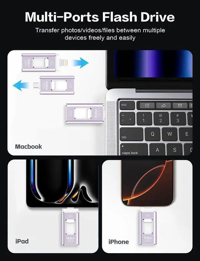 (Note: For iPhone/iPad No App Required; For Android only Needs OTG Enabled, No Extra App. ) ^^ Blazing Fast Transfers AnywhereEquipped with upgraded high-speed chips, this portable phone external storage flash drive lets you transfer massive files in secondsno WiFi, no data cables needed. Save time when sharing photos or moving large video projects, whether youre traveling, working, or creating content. ^^ Universal Compatibility with Dual InterfacesFeaturing USB-C, USB-L, USB ports adapter, this Compatibility iPhone photo storage stick connects seamlessly with iPhone/iPad devices, Android OTG phones, laptops, and tablets. No iCloud fees, no internet requiredjust plug in and move files freely between your phone, computer, and other devices. ^^ Easy to Backup, Enjoy AnywhereEasy to use, plug and play. With just one click, you can quickly back up videos, photos, contacts, and documents, eliminating tedious copying and pasting. Simply plug in your iPhone, iPad, or Android phone. Files are saved directly to the iPhone storage, freeing up valuable space. You can also share files directly from the photo stick for iphone to social media with one click, instantly sharing moments with friends and family.