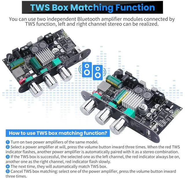 TWS BOX FUNCTIONSet of 2 pack of ZK-1001U, as a mono amp, this power amplifier module support TWS BOX mode, this couple of ZK-1001U mono power amps, you can use this two independent Bluetooth power amplifier boards connected by T