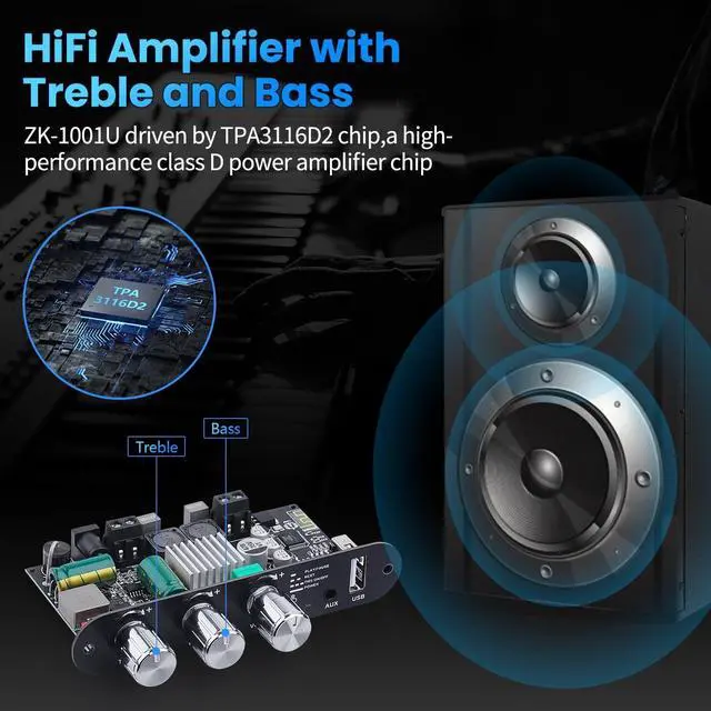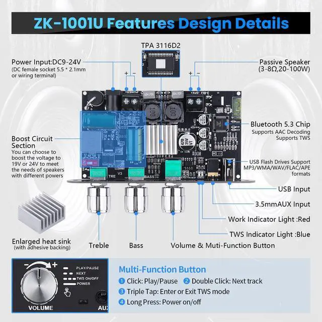 ZK-1001U MONO AMPFILIER BOARDZK-1001U Mini Bluetooth audio amplifier board is a mono channel amp with 100W rated power, only contact a passive speaker(20-100W, 3-8), DC7-24V/4A above (Cannot be connected to AC, suitable for 7.4V/12V/21V etc. batteries, not suitable for 24V batteries). this mono ampfilier with a TPA3116D2 chip, distortion rate below 0.3%, and the upgrade Bluetooth 5.3 chips support AAC decoding, APP and TWS, low latency