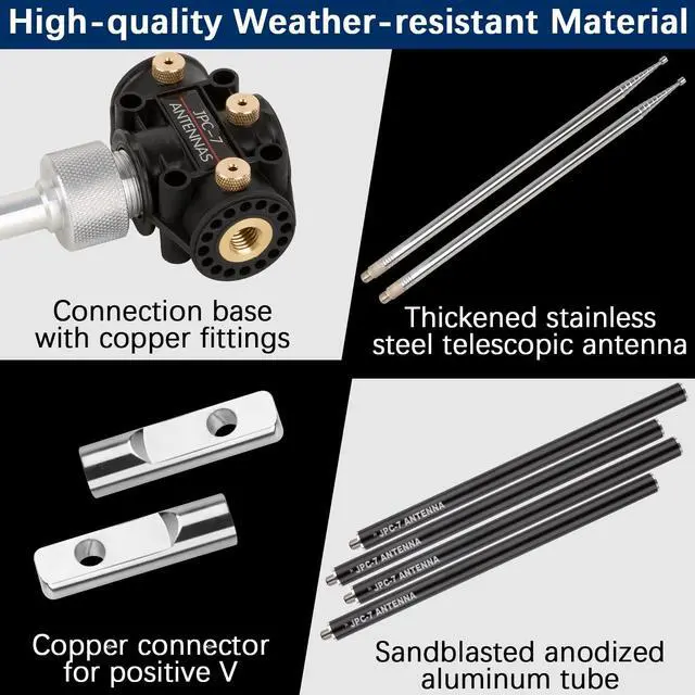 Just slide the adjustment block and it becomes simple and easy to adjust the standing wave. ^^ Strong DurabilityAdopting high-quality weatherproof materials, the base coil and aluminum tube adopt oxidation process and aluminum alloy material, thickened stainless steel antenna, to ensure long-term and reliable use in various climate conditions. ^^ Excellent Gain PerformanceHF high-frequency antenna has high gain, which can improve signal strength and provide you with excellent reception effect, ensuring stability and clarity during long-distance communication. In harsh environments, high-frequency signals can maintain stable communication at a longer distance without noise.