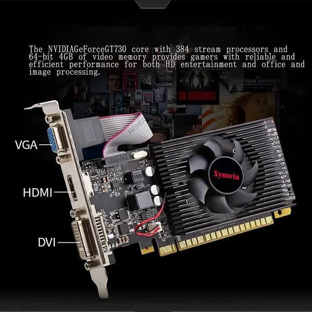 4G DDR3 Memory A great upgrade for your integrated graphics, the GeForce GT 730 accelerates the overall performance of your PC. GeForce GT 730 graphics card is with 4G DDR3 high-speed video memory graphics card ensures up to 1334 Mhz speed, which can speed up your PC multimedia experience very well and enjoy ultra-fast web browsing and incredible photo and video editing experience. ^^ Faster Heat DissipationThe nvidia graphics card is equipped with independent cooling fan, which keep the GPU cooler and running stronger, provides a quiet gaming or movie experience. Enjoy all your videos and pictures at HD resolutions, with faster video/photo editing, faster web browsing, and faster gaming performance compared to integrated graphics.