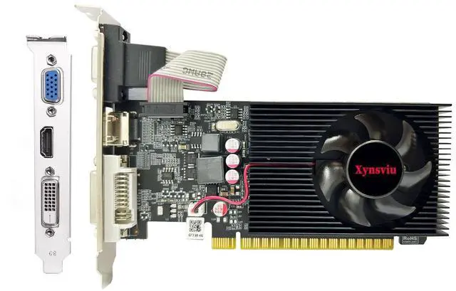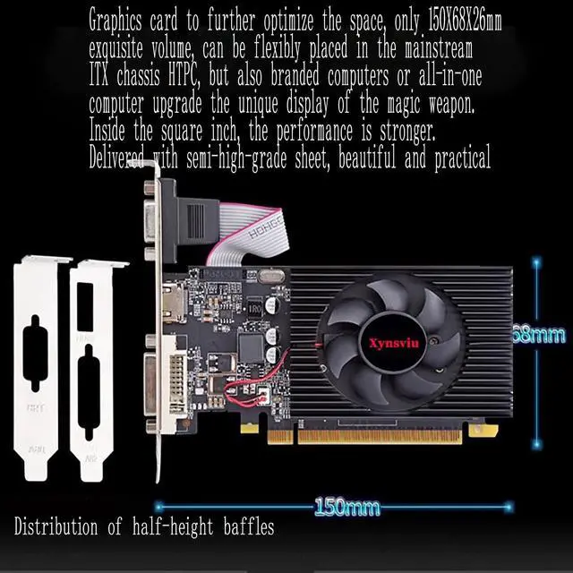 ^^ Low profile DesignThis low profile graphics card with single cooling fan is perfect for small form factor or full sized systems, small size, easy to install, plug and play. Includes two low profile brackets for easy integration into HTPCs and other small form factor systems to ensure compatibility with many of todays system case sizes. ^^ Multiple InterfacesPCI Express 2.0 interfac, offers compatibility with a range of systems. Includes 1x VGA, 1x Dual-link DVI-D, 1x HDMI outputs for expanded connectivity, support up to 2 monitors simultaneously. ^^ Independently Powered30W Low Power, no external power supply and the all-solid-state capacitor Keeps low power consumption and high performance.