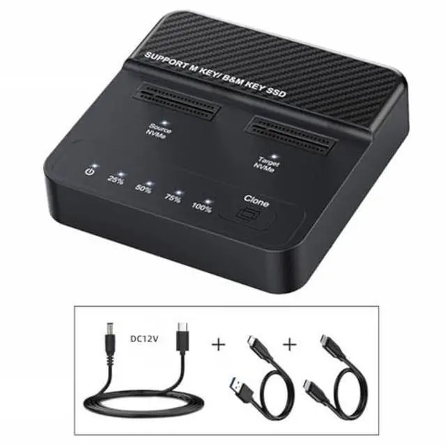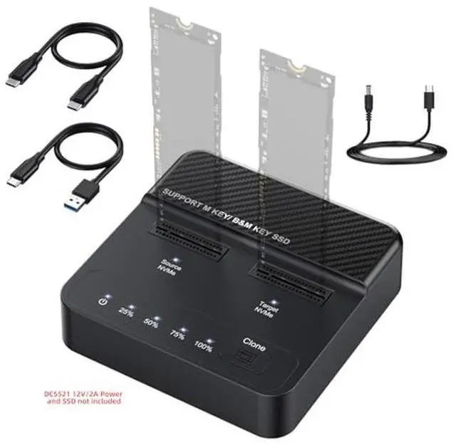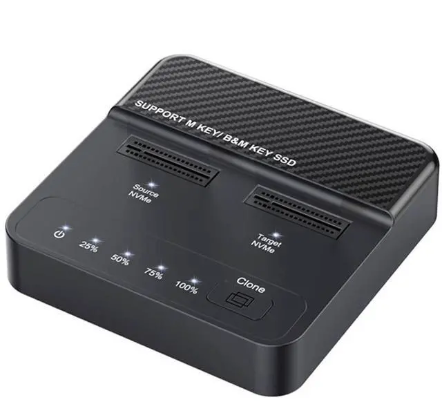 One-Click Offline Clonee: The SSD Docking Station is a dual-bay device that supports one-click cloning from the source disk to the target disk; Be sure to disconnect the data from your computer before starting cloning; Cloning process will delete all target drive's existing data; Target drive will be cloned to be the same asthe source drive in partition, format and data; The target drive has to be at least equal or largerthan the source drive in capacity to use offline drive to driver cloning.