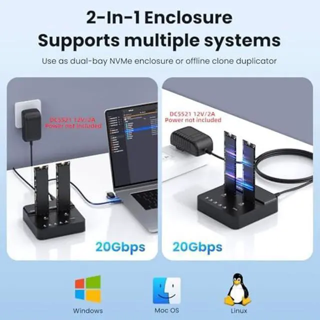 Storage Expansion Flexible: The Dual NVMe SSD Cloner supports up to 8TB, which equates to two 4TB SSDs. Equipped with a Type-C (20Gbps) & Type-A (10Gbps) data cord, it can help you connect your mobile phones, tablets, laptops, desktop computers and other devices to expand your storage capacity.
