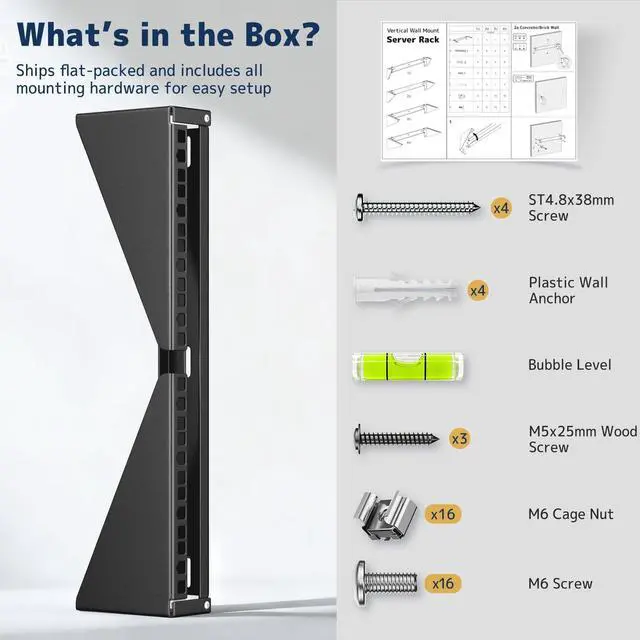 Install: Arrives preassembled with M6 cage nuts, screws, and wall mounting hardware. Mounting holes spaced 16" on center for compatibility with standard wall studs