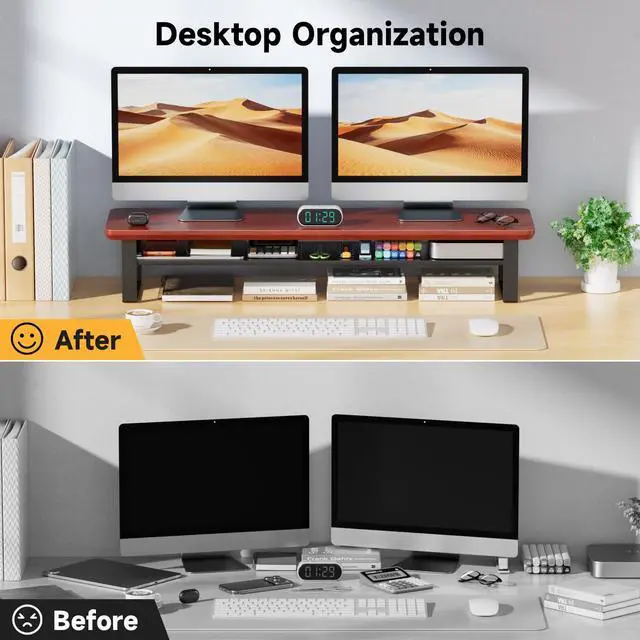 Large Monitor StandMeasuring 35.4"L x 9.3"W x 6.3"H, this expansive monitor stand offers a wide and stable platform capable of holding dual monitors, a laptop, and even a TV simultaneouslyperfect for both multitasking and entertainment setups. It transforms your desk into an organized, clutter-free command center that maximizes productivity and enhances your visual experience. ^^ 2-Tier Desktop OrganizerThe desk shelf features a smart two-tier design that instantly doubles your usable space. The top tier elevates your monitors or laptop to an ergonomic height, while the lower tier provides organized storage for accessories, documents, and tech gear.