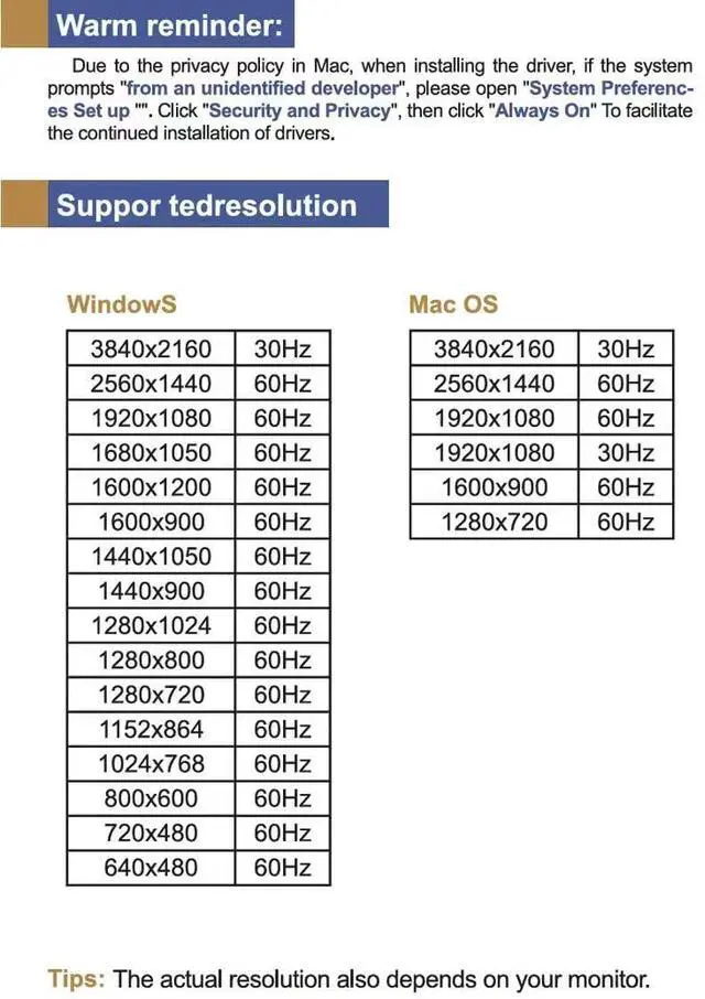 ^^ Warm Reminder: Due to the privacy policy in PCs, when installing the driver, if the system prompts "from an unidentified developer", please open "System Preferenc-es Set up "". Click "Security and Privacy", then click "Always On" To facilitate the continued installation of drivers. We offer a one-year warranty for these cables. If you have any questions, please contact us and our professional customer service will reply to you within 24 hours.