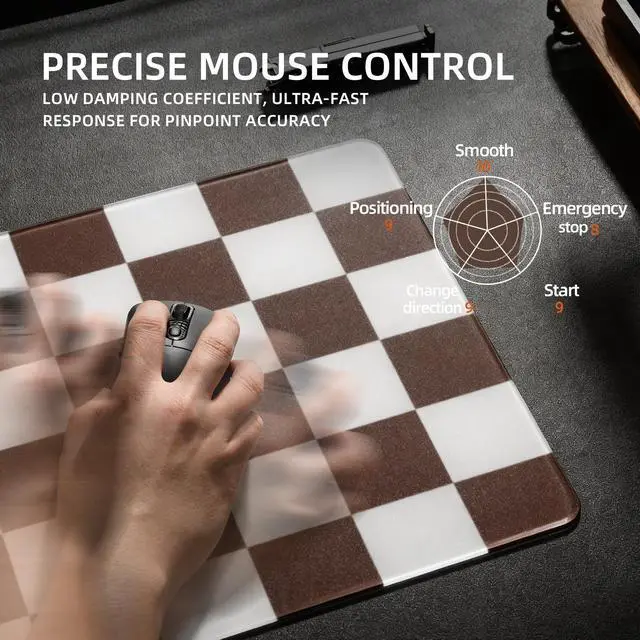 Ultra-Precise Mouse ControlFeaturing a micro-etched tempered glass surface, this hard mouse pad delivers pinpoint accuracy and ultra-smooth gliding for fast, responsive mouse movements. Zero frame delay, ideal for FPS/RTS gamers, graphic designers, office workers, and students who demand stable and precise control. ^^ Premium Tempered Glass DurabilityMade of high-strength, impact-resistant and scratch-proof tempered glass with polished rounded edges. Built for long-term heavy use without deformation, offering far greater durability than traditional fabric or plastic mouse pads. ^^ Stylish Khaki Checkerboard DesignAdopts high-quality UV back-printing technology to ensure the classic khaki checkerboard pattern stays vibrant and wear-resistant.