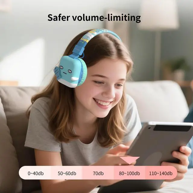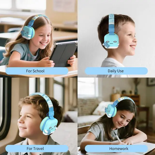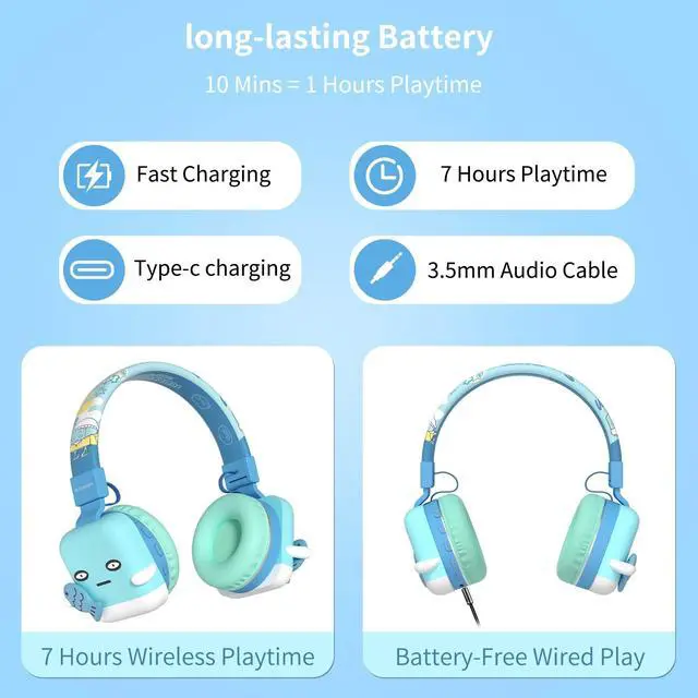[Kid-Safe Volume Limiter] 85 dB Kids Mode & 105 dB Factory Modetriple-click to switch; no app, no accidental bumps, protect little ears anytime ^^ [Comfortable & Foldable] 230 g feather-weight; adjustable silicone headband & memory-foam pads remove for wash; ear-cups fold palm-size, slip into any school bag ^^ [Wireless & Wired] 20-hour Bluetooth battery; plug the included 3.5 mm cable for unlimited wired modeno downtime on any device ^^ [Cute & Adorable] Great sound meets kid-friendly funevolved cartoon design that children actually want to wear ^^ [Bluetooth 5.4 & Built-In Mic] BT 5.4 for class-zero lag; one-button play/pause/answer, built-in mic hands-free for study, class or playno phone fishing ^^ [Perfect