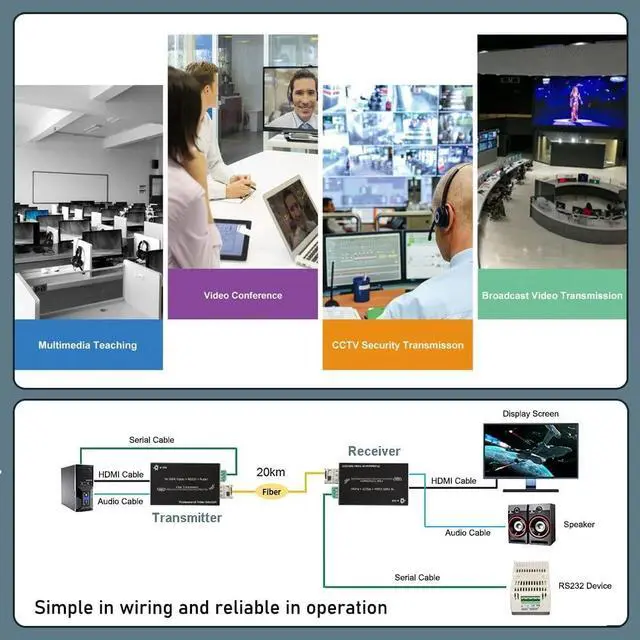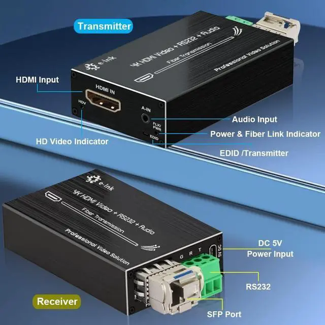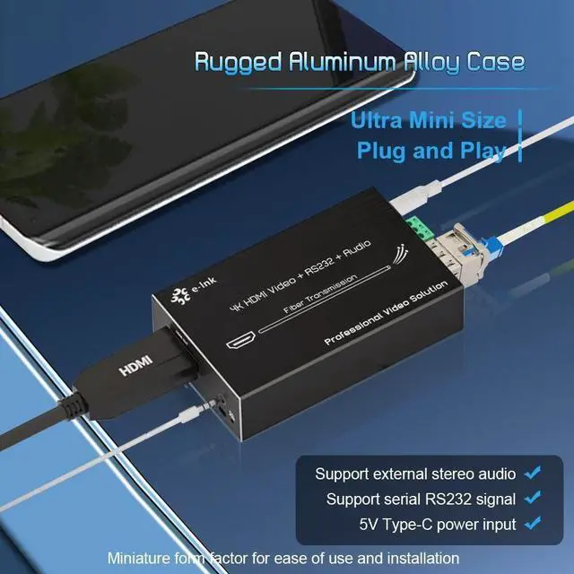 Ultra HD 4K Resolution- This HDMI optical transceiver supports up to 4K*2K@60Hz resolution, compatible backwards with lower resolution. ^^ Support Backward RS232- The HDMI fiber extender support serial RS232 signal, you can control the RS232 serial devices from remote side. ^^ Support External Stereo Audio- The HDMI Extender is designed with 3.5 mm external stereo audio, audio and video synchronous transmission. ^^ Uncompressed Transmission- HDMI to fiber converter can transmit the uncompressed signals up to 12.5 Miles with no delay and no loss. ^^ Mini Size 2.87 x 1.73 x 0.69 in- The 4K HDMI fiber extender has miniature form factor for ease of use and installation, adopts rugged aluminum material.