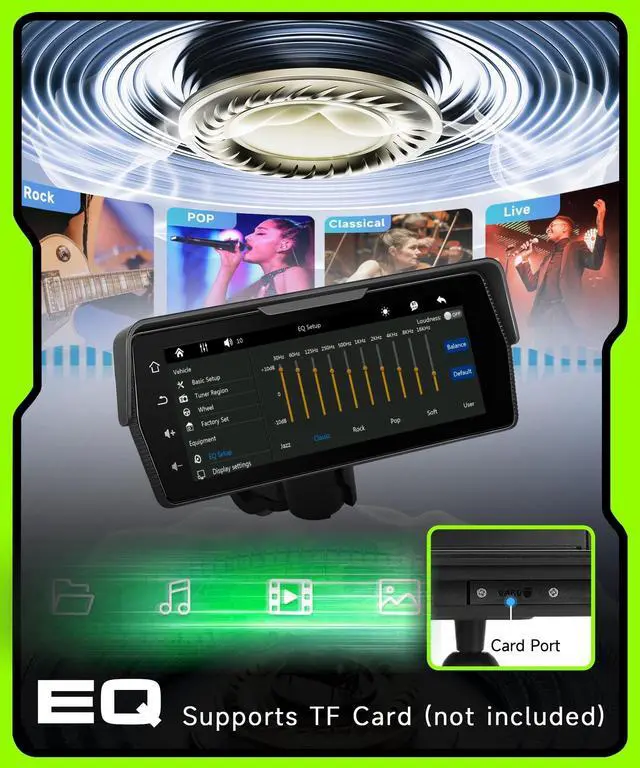 ^^ Airplay & Android Cast Portable car radio for motorcycles supports the functions AirPlay and Android Cast. Support iOS system and Android system mobile phones for the reflection interconnection. After successfully combining the AirPlay or Android cast function, you can transfer the content of your mobile phone to the portable car radio to navigate, watch videos, listen to music and use other functions that make your driving more comfortable and convenient. ^^ EQ Setting & BT The motorcycle navigation system has an integrated equalizer with excellent noise suppression and bass increase. Motorrad CarPlay Radio adjustable EQ sound modes, such as jazz, pop, classical, rock, etc, to meet different audio needs.