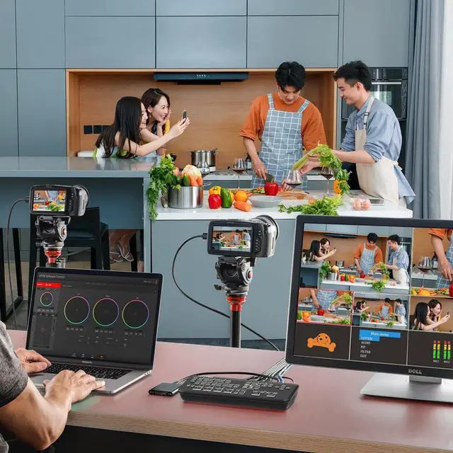 AUDIO MIXER: 2 x microphone audio input, 1 x 3.5 mm stereo analog audio input, 1 x 3.5 mm stereo analog audio output. features a full Fairlight audio mixer and all HDMI audio inputs and both microphone inputs are all connected separately to the audio mixer so you can live mix from all audio sources, giving more video audio editing solutions ^^ Supports a maximum resolution of 1080P@60Hz. Equipped with a Type-C video capture interface, supports direct recording of your streaming data to USB flash disks. It supports OBS, vMix, VCL, Potplayer, and other market software, which can achieve online video recording and streaming. Support custom streaming, more choices, and more exposure. To achieve online video recording, streaming ^^ Support RGB (Red, Green, or Blue) background cutout; Create Amazing Virtual Sets, can do fixed camera virtual sets by loading prerendered still image backgrounds from the media players and media pool. Suitable for video conferences, live broadcasts, weddings, eSports, etc.
