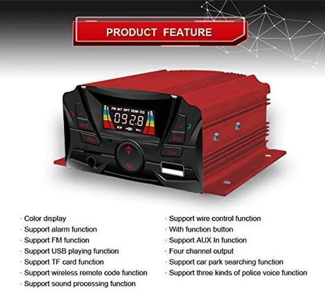 Voltage: DC 12V (36V-72V Model need an adaptor)Bluetooth V 3.0 +EDR, support AVRCP 1.0, GAVDP 1.0, AVDTP 1.0, A2DP 1.0F requency