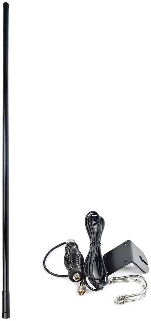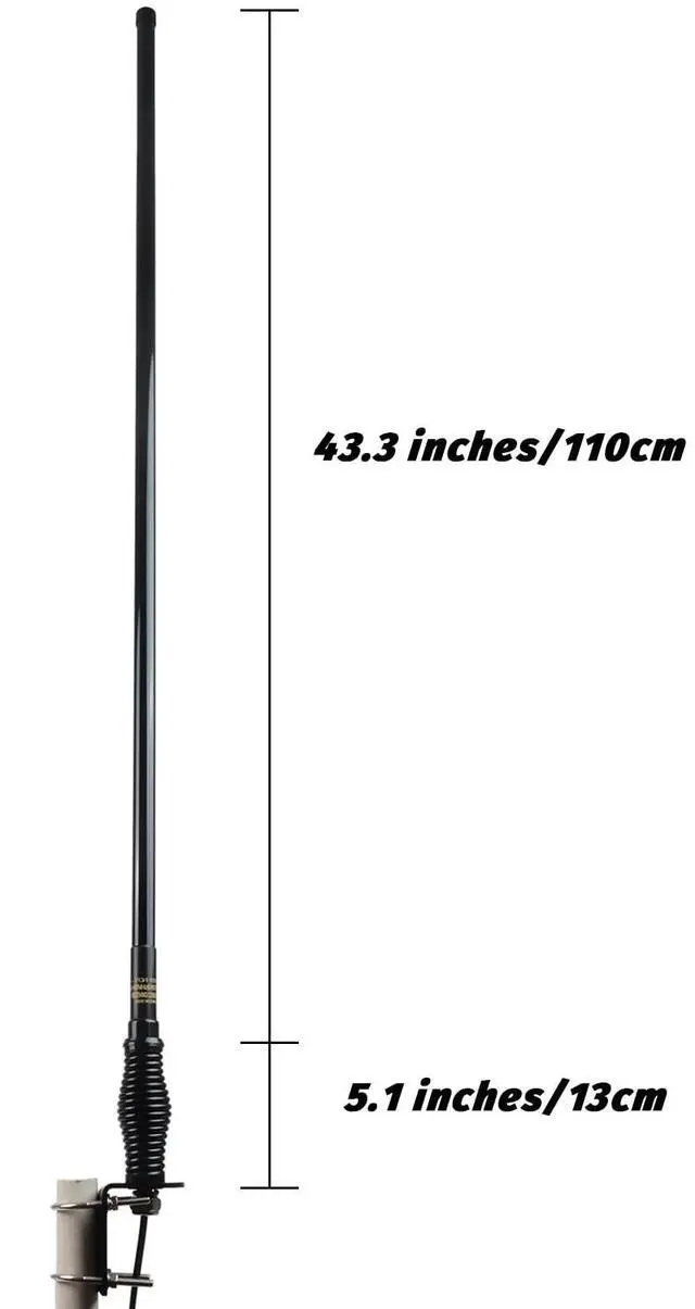Beam Width: 30The 43.3 inches/110cm heavy duty antenna is made of black fiberglass, corrosion-resistant, anti-aging, fully adapted to outdoor environments, and still maintains good performance after years of use. The spring base has great flexibility. It allows the antenna to flex when the car vibrates while driving, effectively minimizing damage to the antenna and making it more suitable for off-road or rough roads. One end of the 5 meter RG58 coaxial cable connects to the spring base and the other end is a PL259 connector to connect to your mobile radio. 144/430MHz dual band mobile antenna compatible with Retevis AnyTone TYT 2Meter/70cm VHF UHF transceiver. Package includes antenna, spring base with RG58 coaxial cable, FME to PL259 adapter, mounting bracket with 2 U-bolts. If you have questions about antenna installation or are missing accessories, please feel free to contact the seller Trust communication.