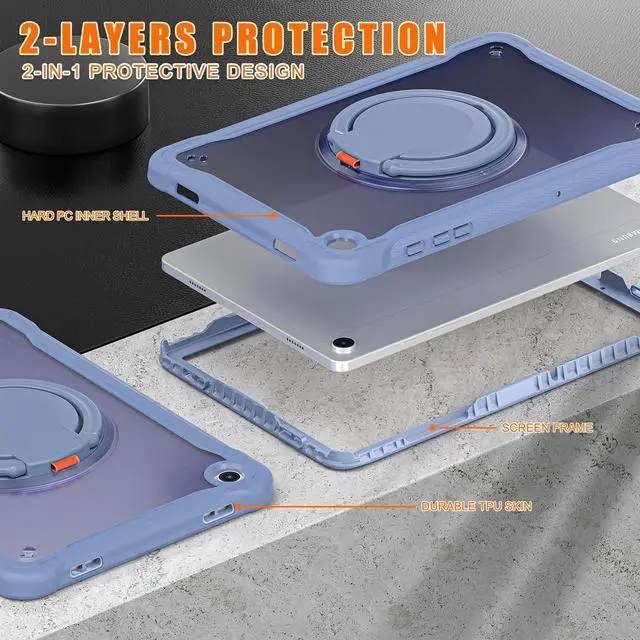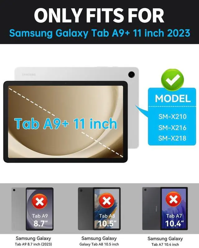 Compatibility: Our protective tablet case only compatible with Samsung Galaxy Tab A9 Plus/A9+ 5G 11 inch 2023 released (SM-X210/X216/X218). Not compatible with any other tablet models. Please confirm your tablet model first. ^^ Shockproof Protection & Precise Cutouts Design: Crafted with a hard PC front cover and premium TPU back, this clear Galaxy Tab A9+ Plus case (screen protector not included) is dirt-resistant, lightweight, and easy to carry. It effectively prevents accidental drops and breaks, even if your kid holds the tablet. Precise cutouts ensure easy access to all buttons, speakers, cameras, sensors and the charging portno need to remove the case. ^^ 360 Rotating & 180