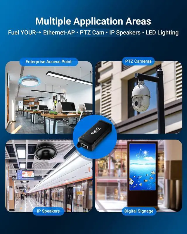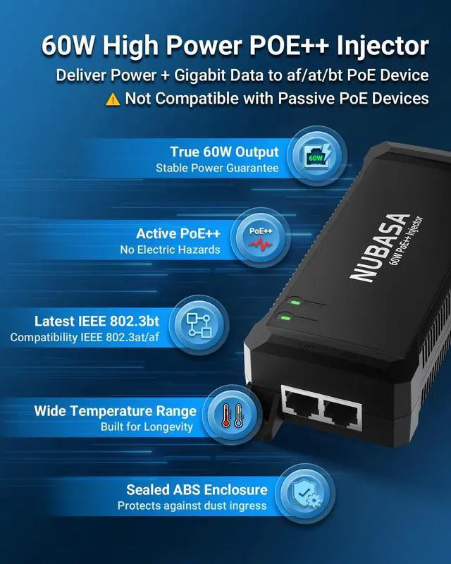 Delivers Up to 60W PoE++ Power Supports IEEE 802.3 bt Class 6 for High-Power Devices The 802.3 bt PoE Injector ideal for demanding equipment like PTZ security cameras, digital signage systems, and network-powered industrial controllers requiring reliable long-distance power delivery ^^ Gigabit Data + Power Over a Single Cat5e/Cat6/Cat7 Cable No Bandwidth LossThe gigabit PoE injector transmits full 1000Mbps speed while delivering powerperfect for stable 4K video streams and real-time monitoring without signal degradation ^^ Extends Power Up to 100m Eliminates Need for AC Outlets at Remote Locations The PoE adapter place powered devices up to 100 meters from your switchideal for outdoor installations, warehouses, or areas where electrical access is limited ^^ Plug-and-Play Setup Works with Non-PoE Switches, Auto-Detects Powered Devices Simply connect your switch to the LAN port and your device to the PoE++ output.