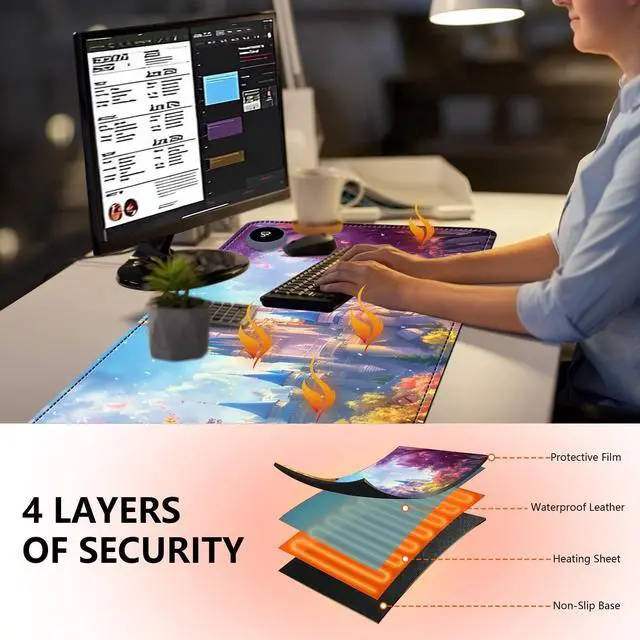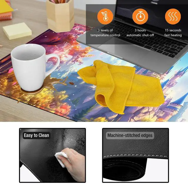 Large Heated Desk MatMeasures 31.5 x 13 inches, providing ample space for your keyboard, mouse, and other desk essentials while protecting your desktop ^^ 3-Level Temperature ControlChoose from 86F (30C), 104F (40C), or 122F (50C) to suit your comfort. Heats up in just 15 seconds for instant warmth ^^ Energy-Efficient & SafeFeatures PT heating film for consistent warmth with low power consumption. Waterproof PU leather surface is easy to clean and safe to use ^^ Customizable Auto Shut-Off Set your preferred safety timer for 1, 2, or 3 hours. The pad will automatically turn off after the set time, providing peace of mind, preventing overheating, and saving energy.