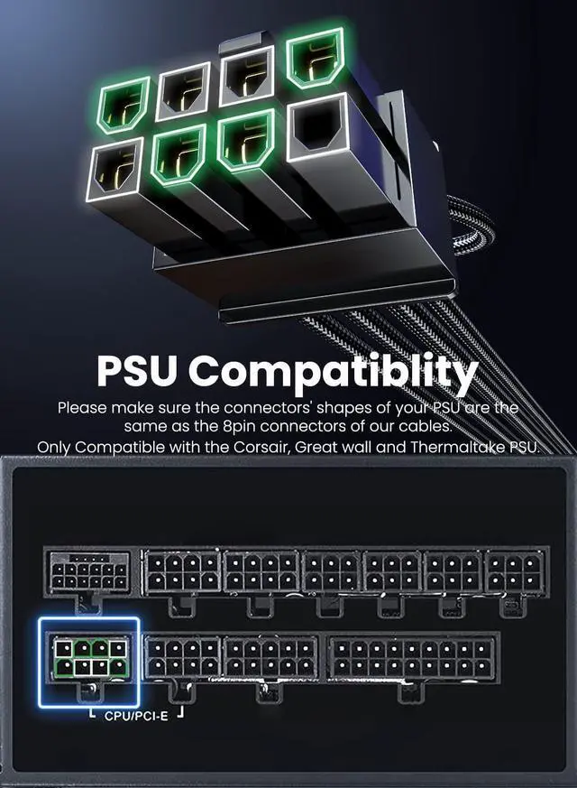 Shopping Notice1, Ensure your PSU is of the brand Corsair/Great Wall/Thermal-take/NZXT Fully Modular power supply listed below and has CPU 8Pin(4+4) ports. 2, Suitable for Full modular PSU only, not for semi-modular/non-modular power supplies. 3, Ensure your PSU output wattage is enough for RTX 4090/4080/4070ti/3090 ti GPU. 4, This 12VHPWR GPU power cable requires 2 unoccupied 8pin ports on your PSU to function properly. Connecting fewer than 2 connectors to the PSU may cause system damage ^^ Designed for RTX 12v 2x6 ConnectorFasgear PCIe 5.0 power cable is designed for GeForce RTX 5070/5070 Ti/4070ti/4070/4080/4090/3090ti Graphics Cards.