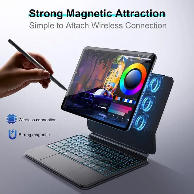 Bluetooth Keyboard: Keyboard for ipad connects quickly via Bluetooth, automatically reconnecting after the first pairing. Within seconds, transforms iPad into a portable laptop. iPad pro 11 inch case keyboard features a strong magnetic floating stand that securely attaches to the case, enabling easy detachment for effortless switching between typing and tablet modes ^^ 7-Color