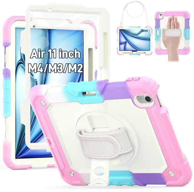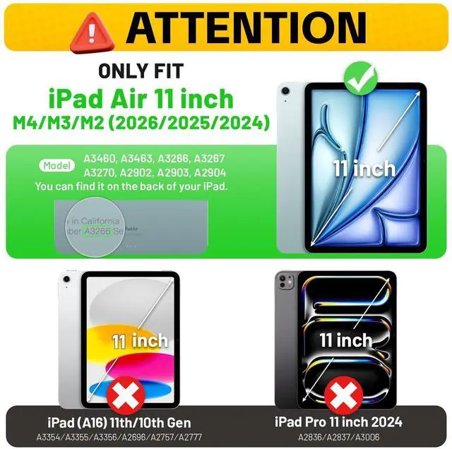 Compatible with iPad Air 11 inch Case M4 / M3 / M2 (2026 / 2025 / 2024) Model Number iPad Case A3459, A3460, A3463, A3266, A3267, A3270, A2902, A2903, A2904. NO Pencil * Easy to install and you can find INSTALLATION VIDEO on this page. ^^ Shockproof & Screen Protector -- This iPad Air11 Case designed with durable anti shock material, built-in screen protector (2 covers to choose, one with built-in screen protector and one without), strong protection and keep your ipad air 11 safe from shock, drop, scratches in daily use.