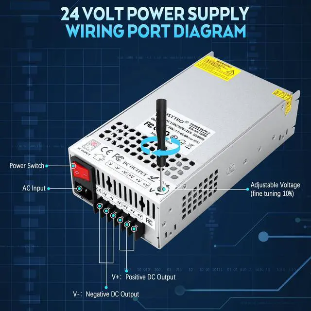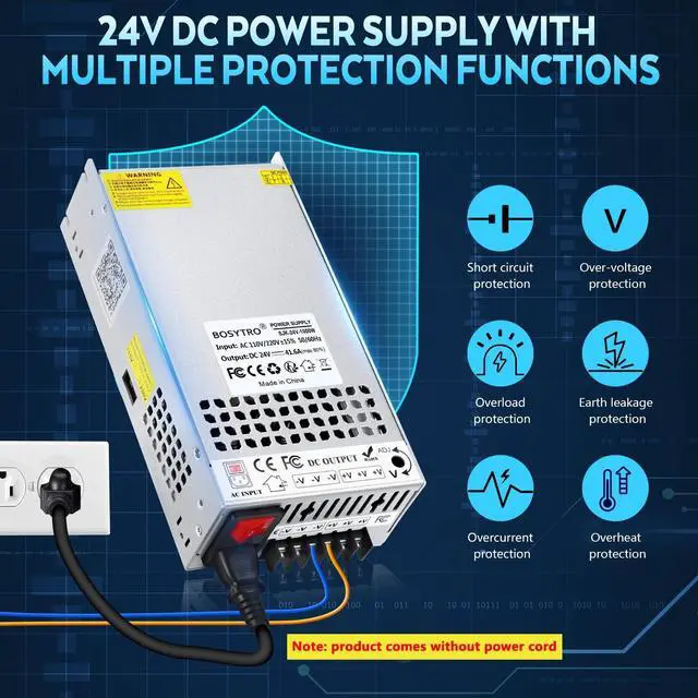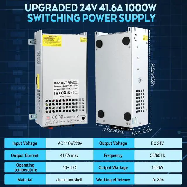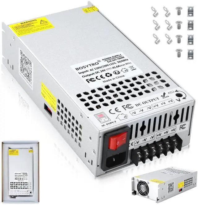 Adjustable range: 10%, Adjustable voltage range is 21.6V - 26.4V, which greatly extends its application range and can provide up to 800watts of maximum power with an efficiency of up to 80%. When connecting equipment with high peak variations, such as motors, please select a power supply at least 2 greater than the rated power of the equipment to ensure safety. ^^ AC/DC 24V Power Supply2. 24 volt power supply, Three output channels are available to supply power to multiple load devices. The new BOSYTRO power supply updates the output ports and adds a power port, eliminating the need to connect separate power cables (Fire, Ground, and Zero) and Installation bracket+connection terminal accessory packagemaking connections easier and faster. ^^ Good Heat DissipationThe power transformer is made of porous metal aluminum material, low noise and good and stable heat dissipation. The 1000W power supply with intelligent temperature control fan, only to reach a certain operating temperature when the fan will run, in order to prevent the converter overheating and failure; The operating temperature range of this switching power supply: 14-140. ^^ Multiple Protections24 Volt 41.6A 1000W dc power supply is strictly tested before leaving the factory, smart chip provides overload auto power off/over voltage auto power off/over heat auto power off/short circuit protection, 110v to 24V converter is RoHS/CE/LVD/EMC safety certified; lead-free process, meets the environmental protection RoHS requirements; provides effective protection for your power safety. ^^ Input Voltage 115V/230VThere is a voltage switch on the side of the 24v dc transformer, we set 115V for American customers at the factory, before using, please check whether the input voltage is 115V, please switch to the local country's voltage to use; to avoid the voltage mismatch damage to the power supply equipment. ^^ Wide Applications The unit converts AC mains power to low voltage DC 24V with a peak power of 41.6A 1000 watts, which works perfectly with most 24V devices under 1000watts, such as LED strips, 3D printers, ham radios and more. LED power supply will automatically output 0~ 33.3A to match your device, the actual current depends on the load, such as 10A (240W), 15A (360W), 20A (480W), 25A (600W), 33.3A (800W).