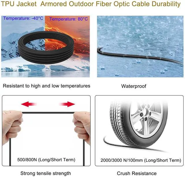 The OM4 LC outdoor fiber optic patch cable, with an industrial TPU jacket, is designed to be strong in tensile strength, highly wear-resistant, waterproof, and capable of enduring high and low temperatures. It is also UV-resistant and bend-resistant ^^ The OM4 fiber optic cable is suitable for various harsh installation environments such as roads, snowfields, industrial fields, and construction sites. It can be installed overhead, buried directly in the ground, or routed through conduits ^^ The OM4 outdoor armored fiber patch cable uses a stainless steel spiral armor tube to provide sturdy protection for the inner core (glass fiber) against damage from rodents and other external factors ^^ OM4 Patch Cable LC to LC is engineered for high-speed data transmission.