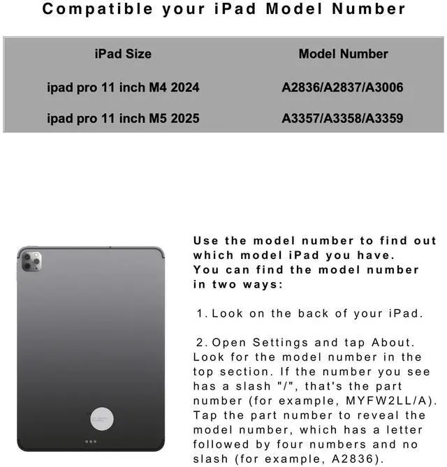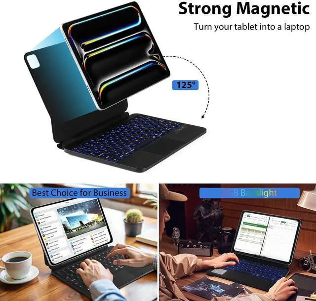 Model Number: A2836/A2837/A3006, Please check the bottom of your iPad for the model number, Axxxx, before purchasing. ^^ The perfect companion for iPad Pro 11 inch M4 2024, Magic Keyboard features a great typing experience, a trackpad, backlit keys, a USBC port for passthrough charging, and front and back protection. No charging or pairing required. Simply attach it and start typing. ^^ When you work in a dark environment, the keyboard keys perfectly match your fingers, 7 color lighting and 3 levels of backlight brightness provides a better viewing and working experience. ^^ Magic Keyboard has a floating cantilever design. It smoothly adjusts to the perfect 120 degree viewing angle. Backlit keys and a scissor mechanism deliver quiet, responsive typing. The built-in trackpad is designed for MultiTouch gestures and using a cursor. ^^ Folds to provide front and back protection wherever you go. Whether you're a blogger, writer, designer, professional or student, The keyboard case offers you a smart, stylish and practical solution to your everyday needs.