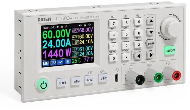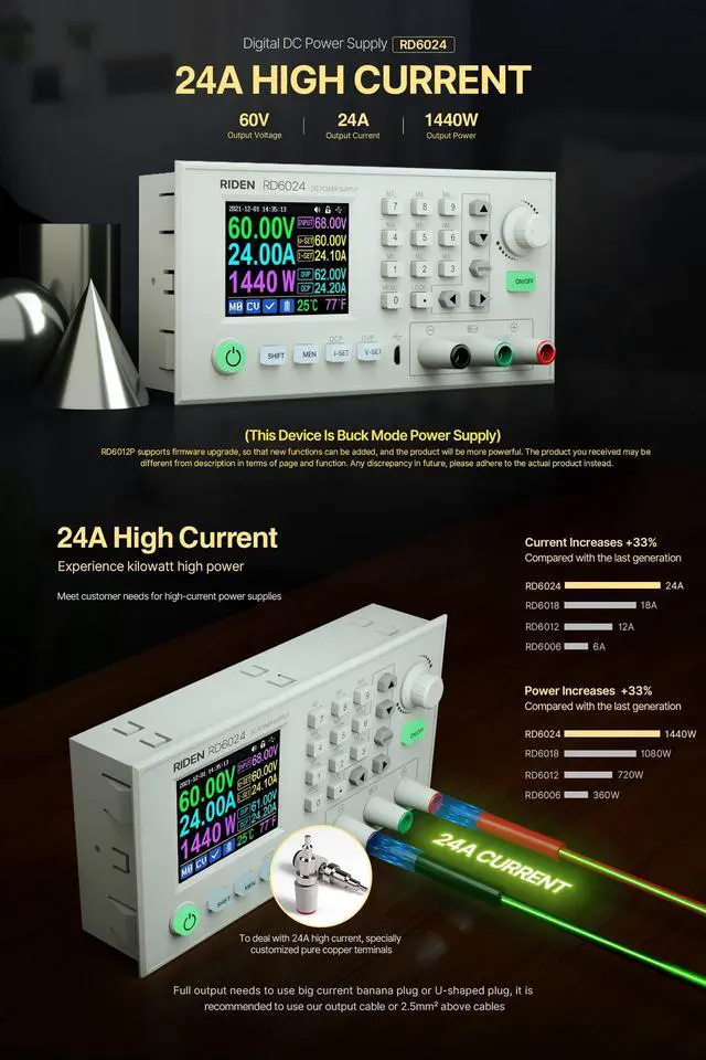 This is RD6024 DC to DC device, not RD6024-W, please notice the difference between them ^^ RD6024 only supports micro USB connection to PC software, no APP. ^^ The output voltage is 0- 60.00V, the output current is 0- 24.00A ^^ There is a backup fuse in the box, if you burn the fuse, you can insert the fuse in the socket next to the burned one for short time use and in 10A range, you still need to replace the damaged one if you want to use full range ^^ Integrated panel, you only need a shell and a AC-DC power source to form a powerful and adjustable power supply.
