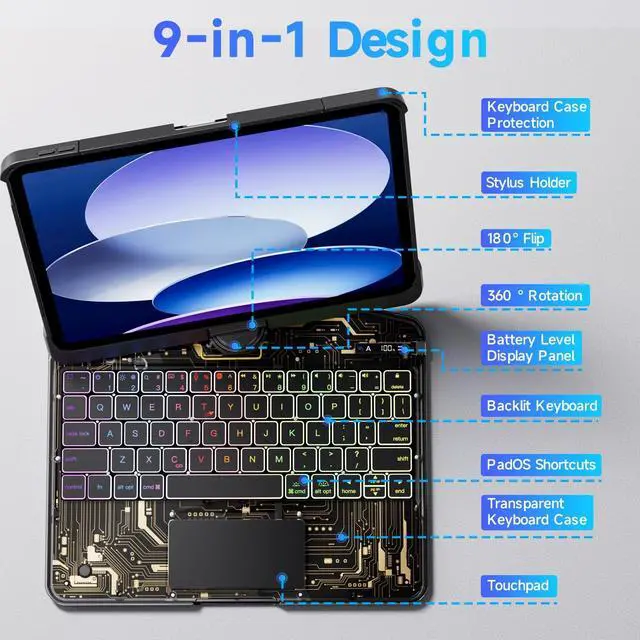 Anywhere: Transform your iPad 11 th and iPad 10 th into a portable productivity machine and switch to getting-things-done modeready to work anytime, anywhere. ^^ Precision Trackpad This for iPad 11th and iPad 10th iPad case with keyboard Navigate iPad in a whole new way with multi-gesture controls that redefine productivity; edit documents, browse the web and build presentations with unparalleled speed. ^^ Shortcut Keys + Battery Display Screen + 7-Color
