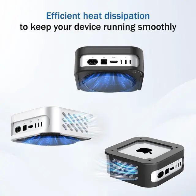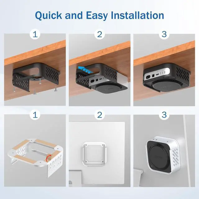 The installation is quick and can be completed in just a few minutes. (Screw installation is recommended for under-desk mounting) ^^ Ventilation DesignNewHail M4 Under Desk Stand features ventilation openings on all four sides to ensure efficient airflow and prevent overheating. Whether mounted behind a monitor, under a desk, or on a wall, it provides excellent heat dissipation. ^^ Full AccessThe skeletonized design not only allows for efficient heat dissipation, but also ensures full access to the Mac Mini M4/M4 Pros power button, ports, and cables. Ensuring that the device function is not affected and convenient for daily operation.