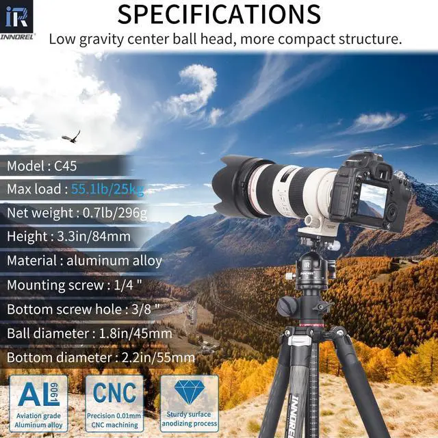 INNOREL C45 Low Profile Tripod Ball Head Universal 360 Panoramic Metal BallHead for DSLR Camera Tripod Monopod Camcorder Slider with Arca Swiss Plate 45mm Ball with 1/4" to 3/8" Screw Load 55.1lb/25kg