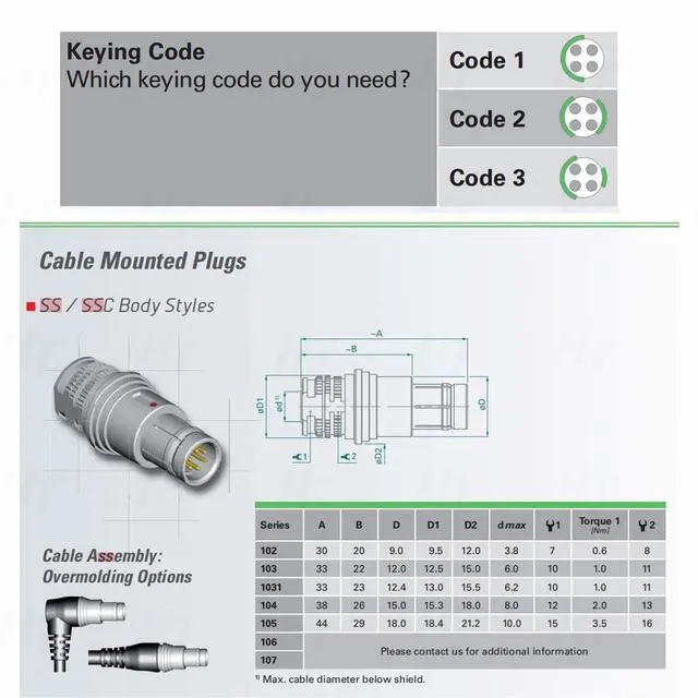 diameter: 0.7 mm ^^ Size 102, keying CODE 1, male polarity, low voltage, silvery color ^^ Short plug, push-pull locking, cable mounting, solder termination, brass material ^^ Reliable, 360 degree complete EMC shielding, shock / vibration / corrosion resistance