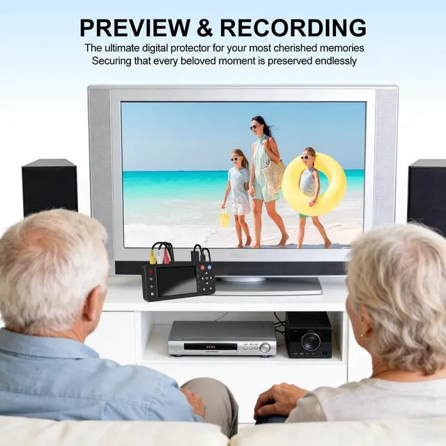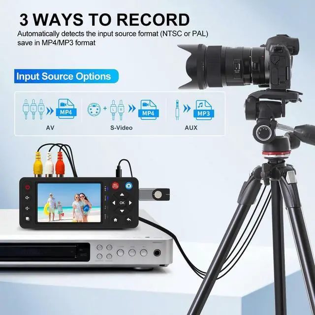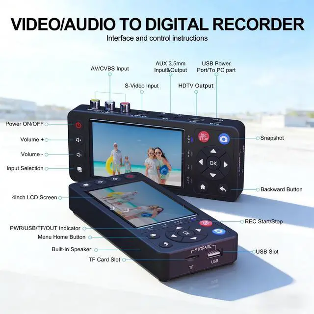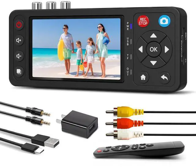 Note: This is a video capture recorder only; it does NOT play tapes or DVDs on its own. ^^ 4LCD Preview & HDMI Output VCR to digital converter Built-in 4-inch preview screen and speaker let you watch footage directly, while HDMI output supports viewing on TVs or monitors. ^^ Large-Capacity USB/TF StorageVideo to digital recorder Supports USB drives (up to 512G) and TF cards (up to 512G) not included. Files may auto-split without quality loss. ^^ Multi-Function Video Recording Supports CVBS video/S-Video and R/L/AUX audio recording, plus screenshot and timed recording. Record at 1080P or auto-detect resolution (NTSC/PAL compatible). Built-in USB/TF speed test ensures stable, smooth recording. ^^ Wide Compatibility with Vintage Devices Digitize video from VHS, VCR, MiniDV, DVD, DVR, camcorder, Hi8, retro game consoles, and more.