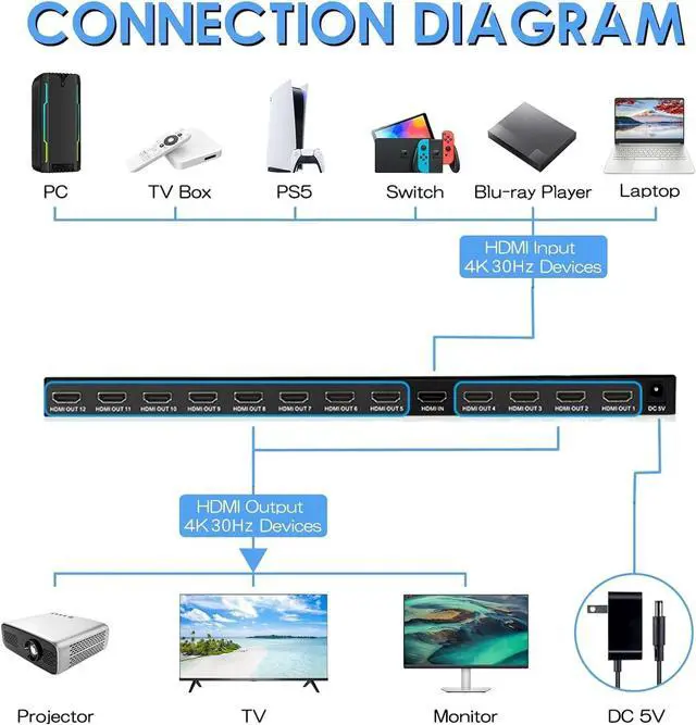 Output: Smart TV, Samsung TV Monitor, etc. ^^ Plug and Play - No need to install drivers, suitable for conference room, home theater, multi-media teaching, office or any other spaces needing to duplicate 1 display to up to 12 screens, and all screens have the same resolution. ^^ Package Contents - 12 Port HDMI Splitter*1, Power Adapter*1, User Manual*1 (HDMI cables not included). You need to use the AWG26 HDMI standard cables. If you have any questions, please feel free to contact us!