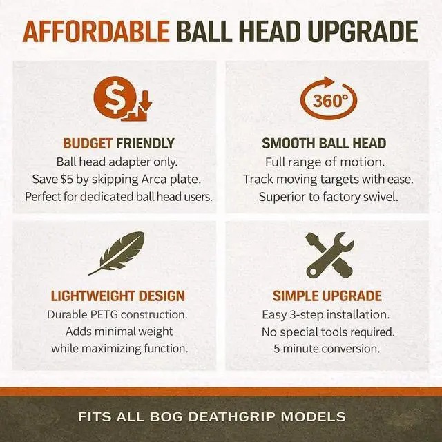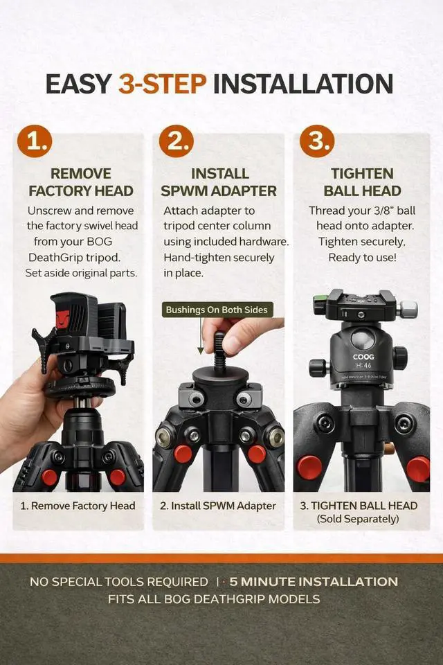 COMPLETE CAMERA MOUNTING KIT: Includes BOG tripod ball head adapter, Arca Swiss camera plate for clamp, mounting hardware, and instructions. Everything needed to convert BOG tripod for professional photography use. Easy 5-minute installation with basic tools. Ball head sold separately (requires 3/8"-16 camera ball head). Fits BOG DeathGrip, Infinite, Carbon tripod models. Transforms basic tripod into professional camera support system for nature and wildlife photography.