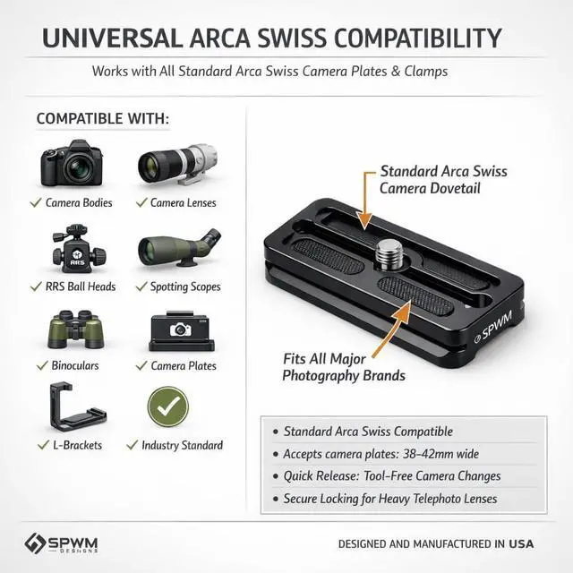 ARCA SWISS CAMERA QUICK-RELEASE SYSTEM: Industry-standard Arca Swiss dovetail accepts camera L-brackets, lens plates, and photography quick-release plates. Works with Really Right Stuff (RRS), Kirk, Wimberley, and other camera plate manufacturers. Enables instant camera body and lens changes during photography sessions. Quick-release clamp holds cameras securely. Perfect for landscape photography, wildlife photography, and nature videography with DSLR and mirrorless cameras. ^^
