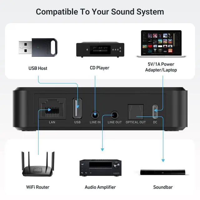 Wireless Sound StreamingThe LP10 is a high-performance wireless audio receiver that supports wireless streaming technologies such as WiFi, Bluetooth, AirPlay 2, Spotify connect, and Tidal connect, allowing you to play your favorite subscription content directly and upgrade your legacy speaker equipment to a wireless audio system.