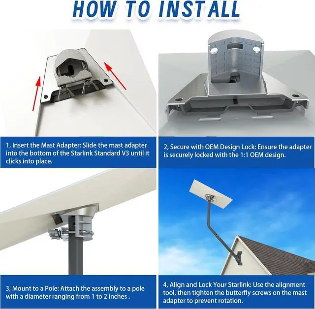 Roof Installation Flexibility: The adjustable mounting pole supports 180 rotation and installs on flat or sloped surfaces, making it suitable for wall, eave, or roof mounting. A locking pin with dual fixing points enhances overall strength and stability for heavy antennas. ^^ Complete Starlink Mounting Kit Easy DIY Setup: Includes 1 Gen 3 pipe adapter, 1 mast clamp, 1 51" mounting pole kit, stainless steel self-tapping screws, wrench, and instruction manual. Designed for a quick, straightforward DIY installation with no special tools required.