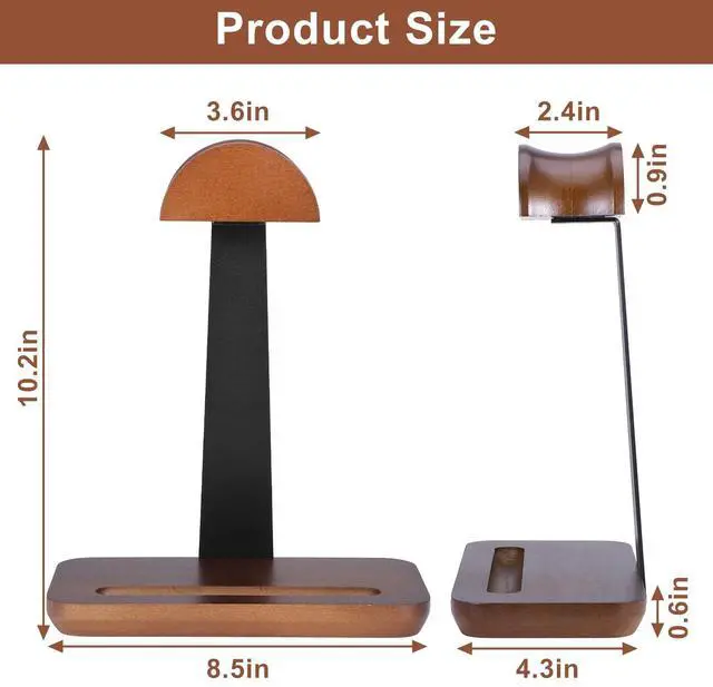 SizeOur wooden headphone stand is 10.24 inches tall, 3.46 inches wide at the top, and 8.46 inches wide at the bottom, ensuring stable support for most headphones without taking up too much space on your desk.
