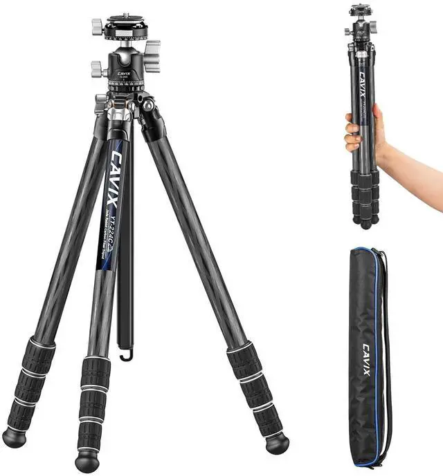 With a 28mm dual panoramic ball head, universal ball head design with 3 locks and 360 dial that photographers adjust angle free and quickly. The quick release plate of the ball head can be easily disassembled in one second. ^^ High-strength carbon fiber tubes provide exceptional stability while minimizing weight. Supports up to 33 lbs (15kg) securely holds DSLR cameras, telephoto lenses, and professional video gear. ^^ The carbon fiber tripod has excellent shock absorption performance. Rubber feet with adjustable angles ensure a solid grip on any terrain from rocky trails to smooth studio floors.