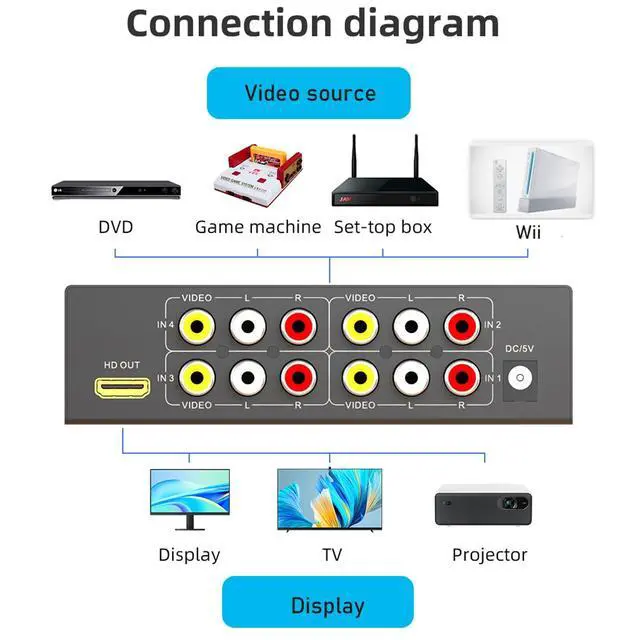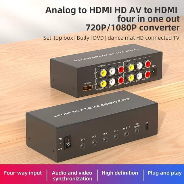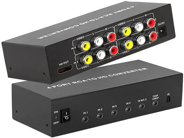 HDMI Converter: BolAAzuL av to hdmi converter supports up to 4 RCA inputs (red/white/yellow connectors) to 1 HDMI output, converts analog composite signal to HDMI 720P/1080P (60HZ) output, displayed on HDTV/Monitor, also supports 4:3 / 16:9 Switching.